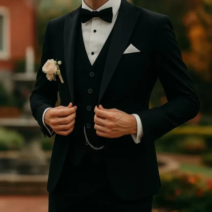 Elevate your formal wardrobe with this Men's Black Custom Made Three-Piece Suit, a timeless choice for weddings, parties, and elegant occasions. This versatile set includes a blazer, waistcoat, and trousers—all expertly tailored for a confident and refined look.