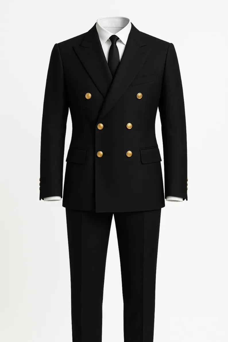 Exude timeless sophistication with our Black 6-Button Double-Breasted Custom Made 2-Piece Men’s Tuxedo. Designed with a premium slim fit, this suit delivers a sharp, modern silhouette while keeping classic elegance intact.